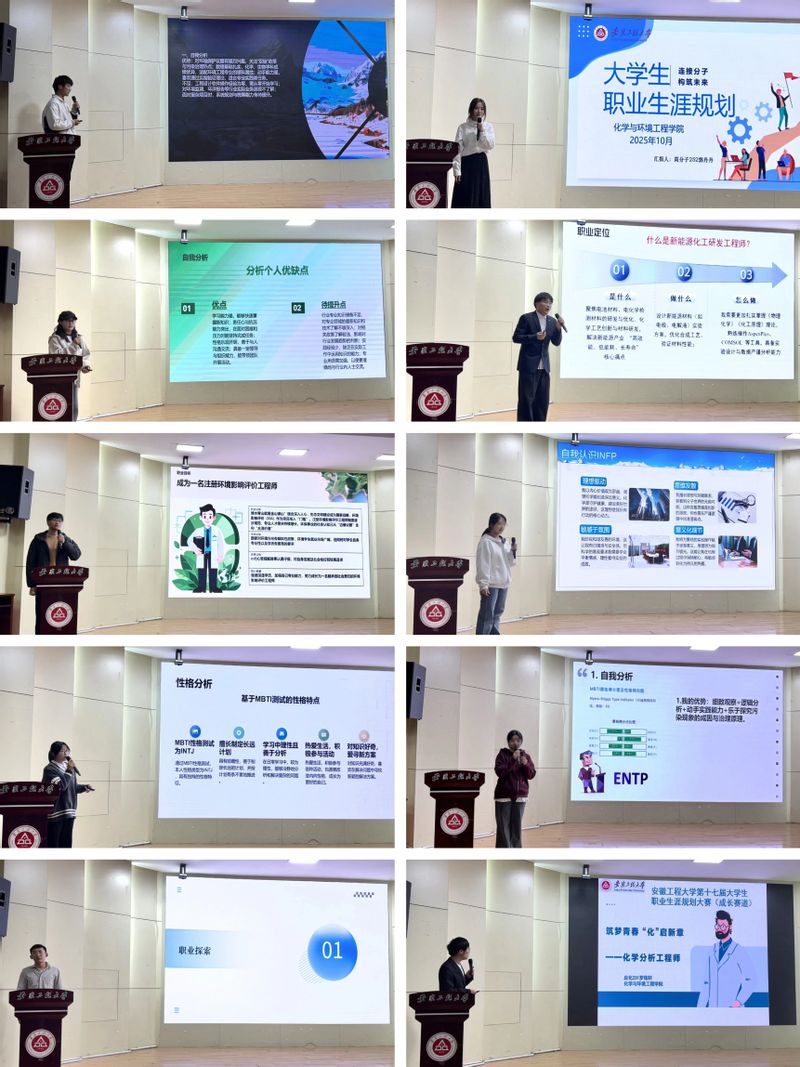 本次大赛,吸引了全院200余名学生报名参与,经过初赛、复赛层层选拔,最终10名选手脱颖而出进入“成长赛道”决赛环节。比赛分为生涯规划书评审和现场展示与答辩两个环节。在展示环节,选手们结合精心制作的PPT,从容自信、思路清晰,从自我认知、环境分析、职业定位、计划实施及评估调整等多个维度,全面阐述了各自的生涯规划。他们的目标多元而具体,涵盖了从技术研发、教育教学、基层服务等多个领域,充分展现了当代大学生视野开阔、思维活跃、敢于追梦的精神风貌。经过激烈角逐,最终评选出一等奖2名、二等奖3名、三等奖5名。